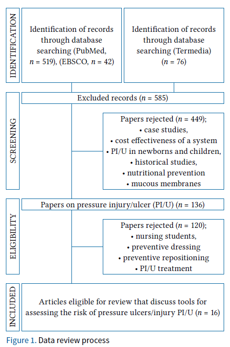 The present study employed a literature review method. A comprehensive review of the available literature from 2015 to 2025 was conducted, using keywords such as “tools for assessing pressure ulcer risk” and “pressure ulcer risk assessment scales”. The following databases were utilised: PubMed, EBSCO, and the national Termedia database. Randomised studies, original studies, and meta-analyses were included. Following a thorough analysis of the existing literature, the collected material was methodically categorised as follows: (a) universal pressure ulcer risk assessment tools, and (b) risk assessment tools in the perioperative period. The present study focused on the analysis of 16 papers; the remaining cited manuscripts provide the necessary background for the discussion of the problem. The process of searching for duplicates is illustrated in Figure 1.