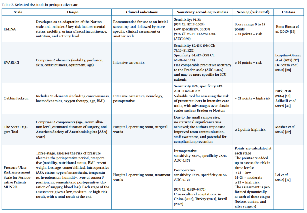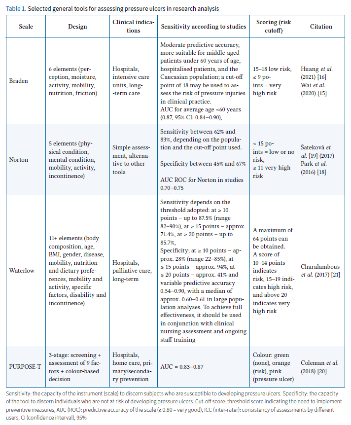 Material and methods: The present study employed a literature review method. A comprehensive review of the available literature from 2015 to 2025 was conducted, utilising the key words “tools for assessing pressure ulcer risk” and “pressure ulcer risk assessment scales”. The following databases were used: PubMed, EBSCO, and the national Termedia database. A comprehensive review of the existing literature was conducted, encompassing randomized studies, original studies, and meta-analyses. Following a thorough analysis of the available literature, the collected material was methodically categorized as follows: (a) universal pressure ulcer risk assessment tools, and (b) perioperative risk assessment tools. The present study focused on the analysis of 16 papers; the remaining cited manuscripts provide the necessary background for the discussion of the problem.