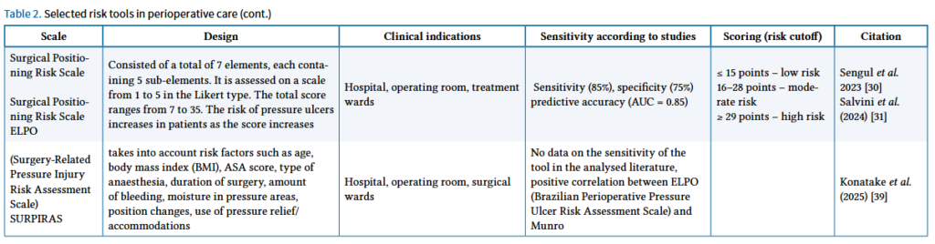Clinical prevention of pressure injuries is based on professional and standard assessment of patients and ensuring adequate protection. A comprehensive understanding of preoperative risk factors serves as the foundation for the implementation of preventive measures. Consequently, the nursing staff can implement preventive interventions prior to the occurrence of tissue injury. The primary preventive measure for pressure ulcers is the utilisation of recommended risk assessment tools for the purpose of conducting an early, systematic, accurate, dynamic, and effective assessment. A variety of preventive interventions are available, including the prophylactic use of multi-layer dressings, the utilisation of alternative pressure mattresses, and polymeric bladder-resistant-elastic (gel) on the operating table during surgery. Additionally, patient and caregiver education on nutrition and skin care, frequent position changes, and the use of positioning wedges are recommended. Scales such as Norton, Waterlow, and Braden were not designed for risk assessment in surgical patients and therefore should not be recommended for use in this context. These scales do not take into account risk factors associated with surgery and have low predictive value and low sensitivity for perioperative pressure injuries. Wei et al. conducted a meta-analysis that indicated moderate predictive accuracy of Braden’s scale. The analysis demonstrated that the scale exhibited good sensitivity and low specificity in critically ill adult patients. The further development and modification of this tool, or the creation of a new tool with higher predictive power, is justified for use in critically ill patients. The existing body of literature on hospital-acquired pressure ulcers (HAPIs) is characterised by a lack of reliable reports. A global analysis of the literature and the 2019 recommendations indicates that significant emphasis should be placed on raising awareness of the risk of pressure ulcers in hospitalised patients. In a systematic analysis conducted by Chen et al., the incidence of pressure injuries during surgery was reported to be 15%. Intraoperative pressure injuries (IAPI) are a prevalent cause of skin damage in the perioperative period. The necessity of anaesthesia and surgical intervention renders patients susceptible to acute, localised tissue injury associated with pressure. This injury manifests within 48 to 72 hours post-surgery and is associated with the specific surgical site. Surgical interventions that extend beyond 2 hours are recognised as a risk factor for the development of pressure ulcers. Aloveni et al. identified 8 significant risk factors associated with HAPI among the surgical population. These risk factors include age ≥ 75 years, female gender, American Society of Anesthesiologists (ASA) grade ≥ 3, low BMI, low preoperative Braden score ≤ 14, and comorbidities such as anaemia, respiratory diseases, and hypertension. The development of a pressure ulcer can have numerous adverse consequences, including pain, the necessity for additional treatment, prolonged hospital stays, deformities, and scarring of the body. These consequences can lead to increased morbidity, elevated treatment costs, and an increase in the workload for nurses by more than 50%, resulting in a 3–4-fold increase in the cost per patient.