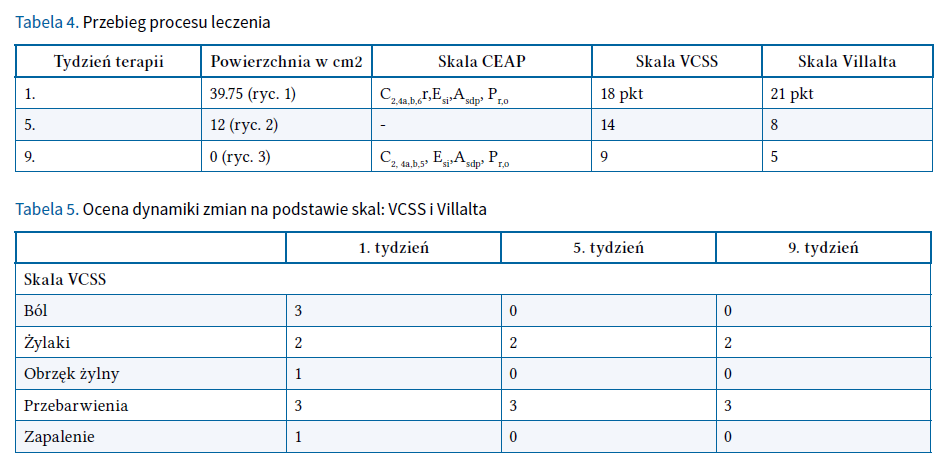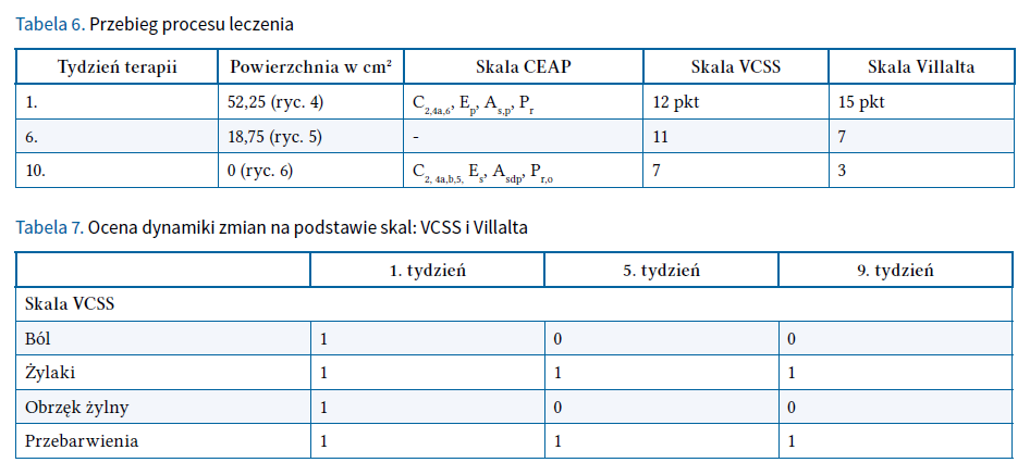W trakcie prowadzonej terapii odnotowano istotny postęp procesu gojenia. W pierwszym etapie doszło do oczyszczenia łożyska rany z tkanek martwiczych, co zapoczątkowało kolejne fazy gojenia. Po 9 tygodniach intensywnej terapii uzyskano pełne wygojenie owrzodzenia. Skala VCSS dobrze odzwierciedliła proces gojenia – od stanu ostrego do utrwalonych następstw, z redukcją punktacji z 18 do 9. Skala Villalta była bardziej czuła na poprawę subiektywnych objawów i wygojenie rany, co przełożyło się na szybszy spadek wartości (z 21 do 5 punktów). Zgodnie z klasyfikacją CEAP po wygojeniu owrzodzenia kategoria C₆ została zastąpiona kategorią C₅.
