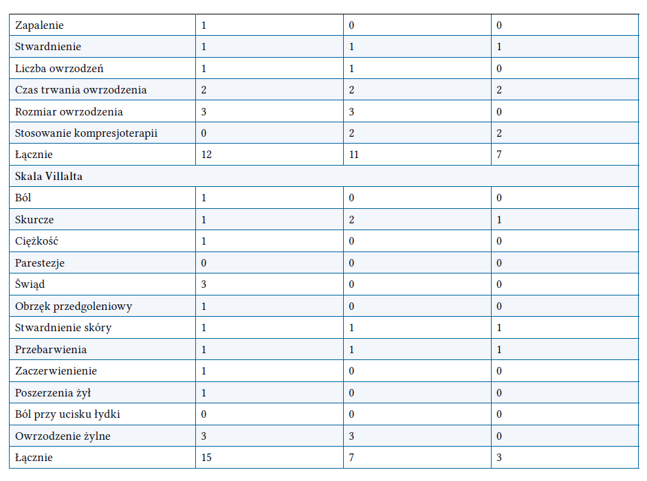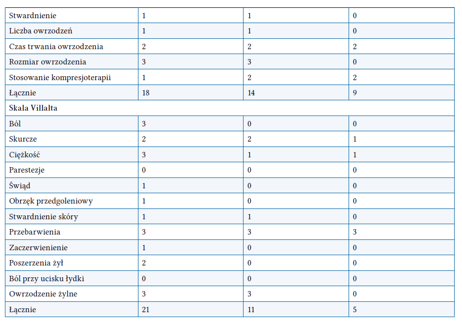Wnioski: Skale, w tym CEAP, umożliwiły precyzyjne określenie stanu wyjściowego i końcowego, VCSS odzwierciedlała zmiany morfologiczne i stopniową poprawę stanu miejscowego, natomiast skala Villalta uchwyciła szybkie ustąpienie objawów subiektywnych i poprawę jakości życia. Wykazano, że rekomendowane skale nie są zamienne, lecz komplementarne. Ich równoległe zastosowanie dostarcza pełniejszego obrazu klinicznego, wspiera proces monitorowania skuteczności leczenia i może przyczynić się do zmniejszenia ryzyka nawrotów owrzodzeń.