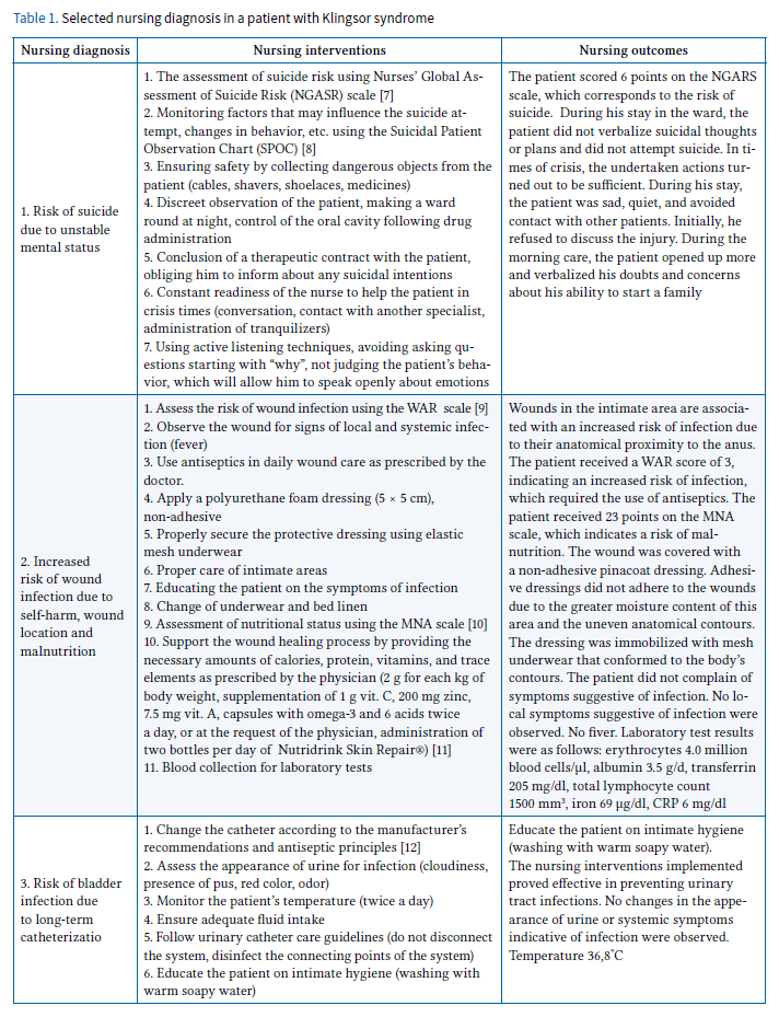 This article presents the case of a patient who self-mutilated his genitals as a result of Klingsor syndrome. The aim of the study is to present the patient’s health problems based on the NANDA nursing diagnoses classification. Patient care should be focused on the patient’s needs, and staff should be provided with current, evidence-based nursing knowledge. A holistic approach to the patient’s problems and the implementation of nursing interventions in accordance with current knowledge prevented complications related to self-harm and positively influenced the improvement of his mental state. Proper wound care is one element of multidimensional care for patients with Klingsor syndrome, but nurses should also recognize other issues arising from the disease.
