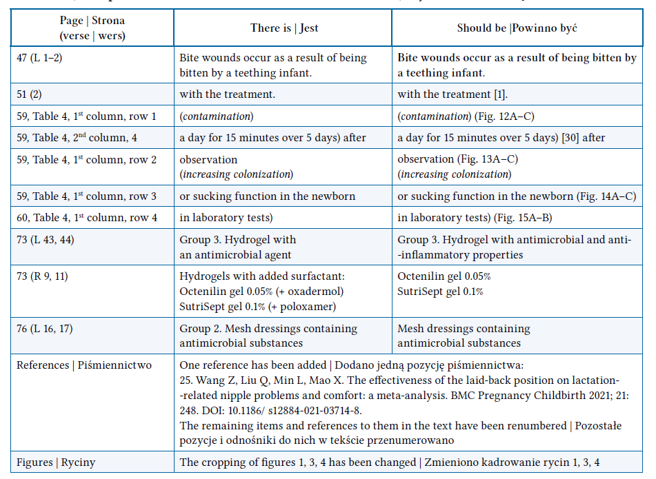 Artykuł Treatment of nipple wounds during breastfeeding. Position of the Center for Lactation Science and the Polish Wound Management Association (DOI: 10.60075/lr.v22i2.103) wydrukowano z błędami
